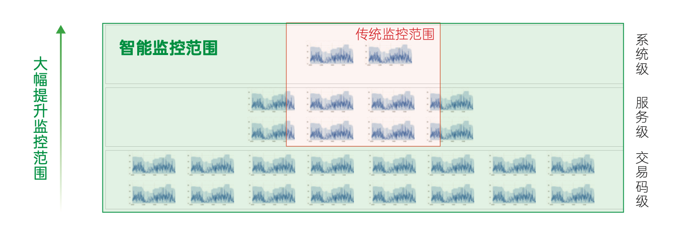结合批量化的告警规则配置以及自动化动态阈值生成,从而在不额外增加人力的情况下几十、上百倍的扩大监控范围,实现 的各级应用的全面监控,可提前发现业务系统的细微异常,化被动运维为主动运维,大幅缩短故障发现时间。