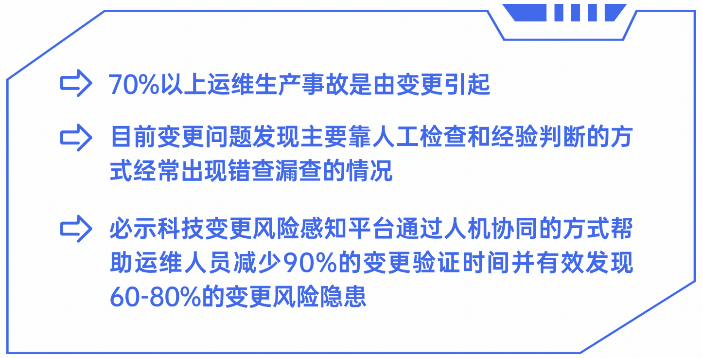 其中,必示变更风险感知平台以数据平台为数据集成能力底座,整合多源、异构运维数据,以运维算法专属平台为智能化能力底座,结合专家业务知识、融合AI算子编排和调用能力,通过平台灵活的编排配置,可以针对各类场景需求,形成标准化的风险检查项,构建面向系统变更的风险识别能力,并借助风险管理流程事项风险闭环管理,达到将知识、AI、自动化、管理规范等融入运维工作流程的目标,并以可量化的衡量标准提升系统变更后运行健康指数。