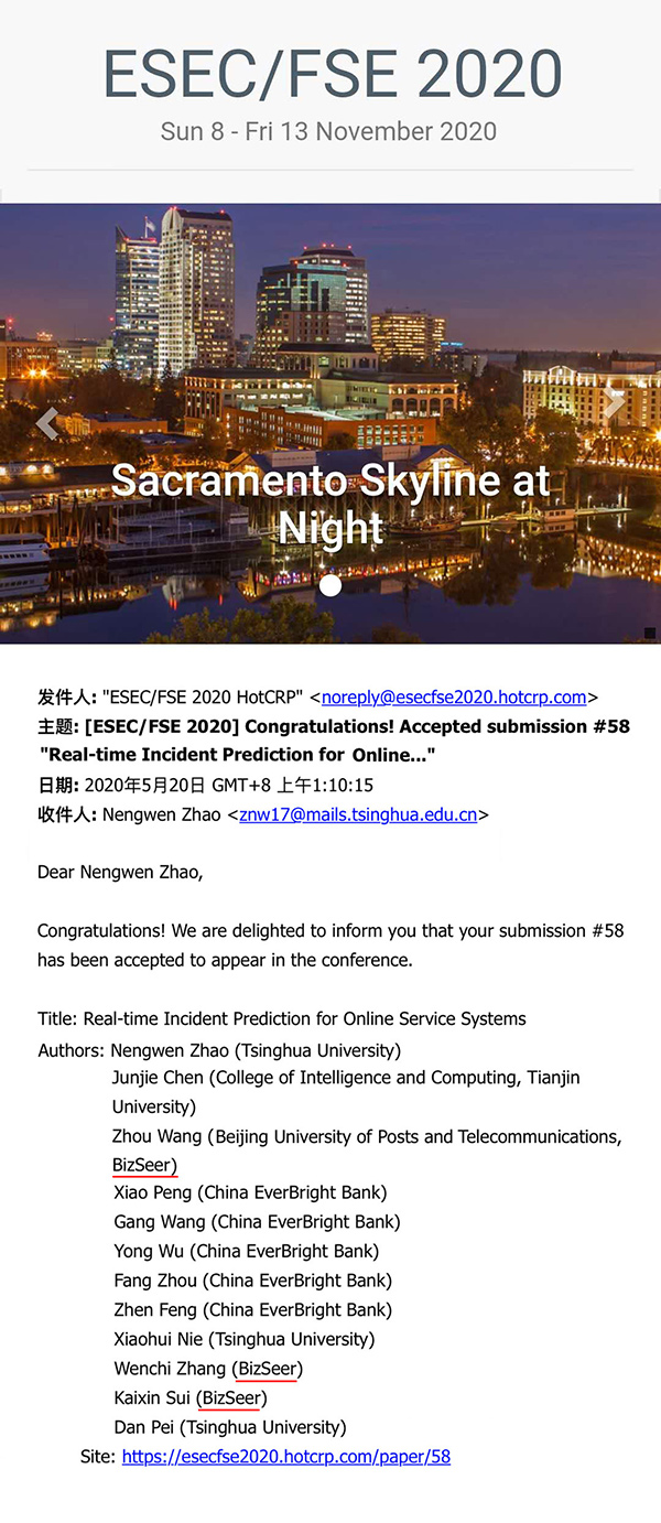 近日,清华大学、光大银行信息科技部、必示科技等合作共研的故障告警与预测解决方案论文《在线服务系统实时故障预测》(Real-time Incident Prediction for Online Service Systems)获得ESEC/ FSE 2020 (ACM Joint European Software Engineering Conference and Symposium on the Foundations of Software Engineering)录用,此次会议共收到360篇论文投稿,最终以28%的录用率收录了101篇。