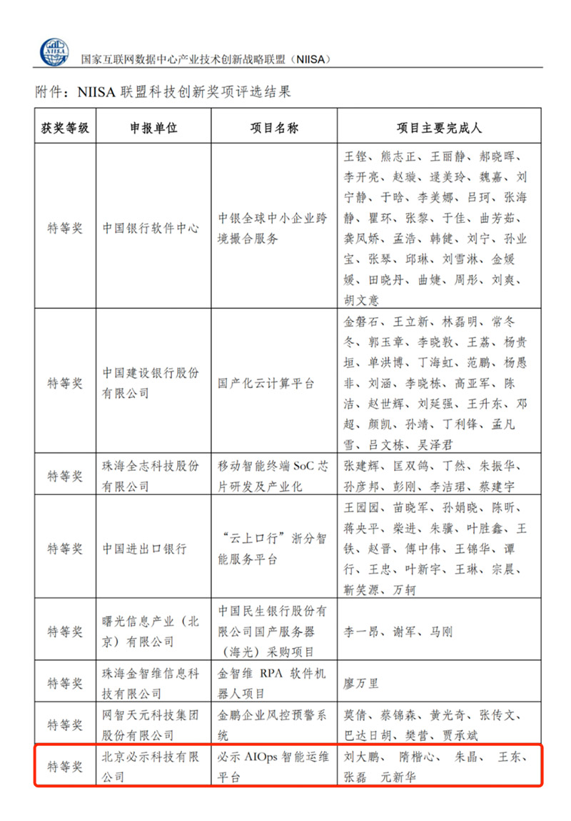 12月30日,国家互联网数据中心产业技术创新战略联盟(以下简称“NIISA联盟”)公布2020年度科技创新奖项评选结果。“必示AIOps智能运维平台”凭借技术创新性和先进性、经济效益和社会效益等方面的突出表现,从200多个项目中脱颖而出,成功斩获“2020科技创新项目特等奖”。同样获得特等奖还有中国银行软件中心“中银全球中小企业跨境撮合服务”、建设银行“国产化云计算平台”等8个项目。