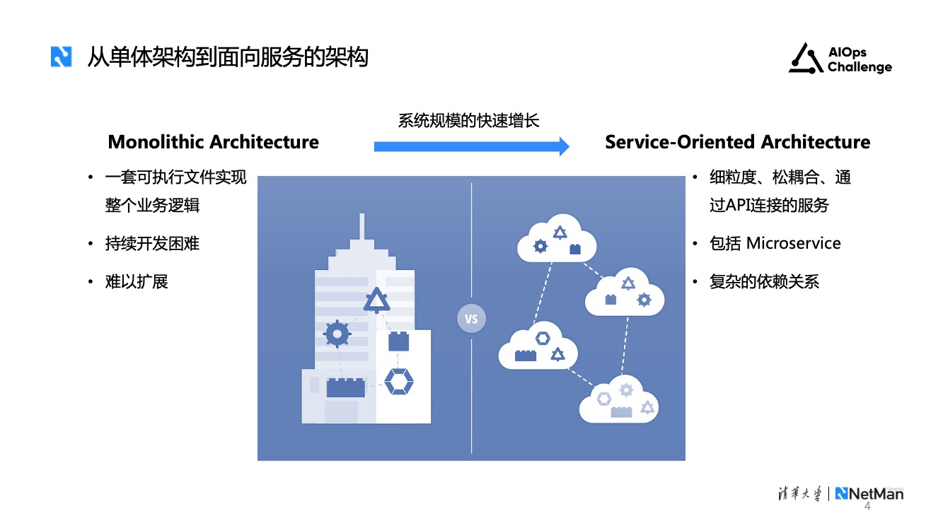 第二个趋势是传统人工运维逐渐向智能运维转变。传统人工运维是基于运维人员的领域知识,人工分析故障原因或者编写自动化脚本进行检查。这一过程耗费大量的时间和人力成本,且人工运维难以应对系统规模增大和复杂度增加带来的挑战。