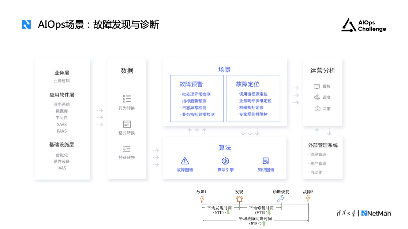 为保证软件服务的可靠性与稳定性,AIOps的核心场景是故障的快速发现与诊断,也就是基于软件架构中基础设施层、应用软件层和业务层采集到的监控数据,基于故障图谱、知识图谱和各种算法引擎,实现故障的及时发现、快速诊断乃至提前预警。
