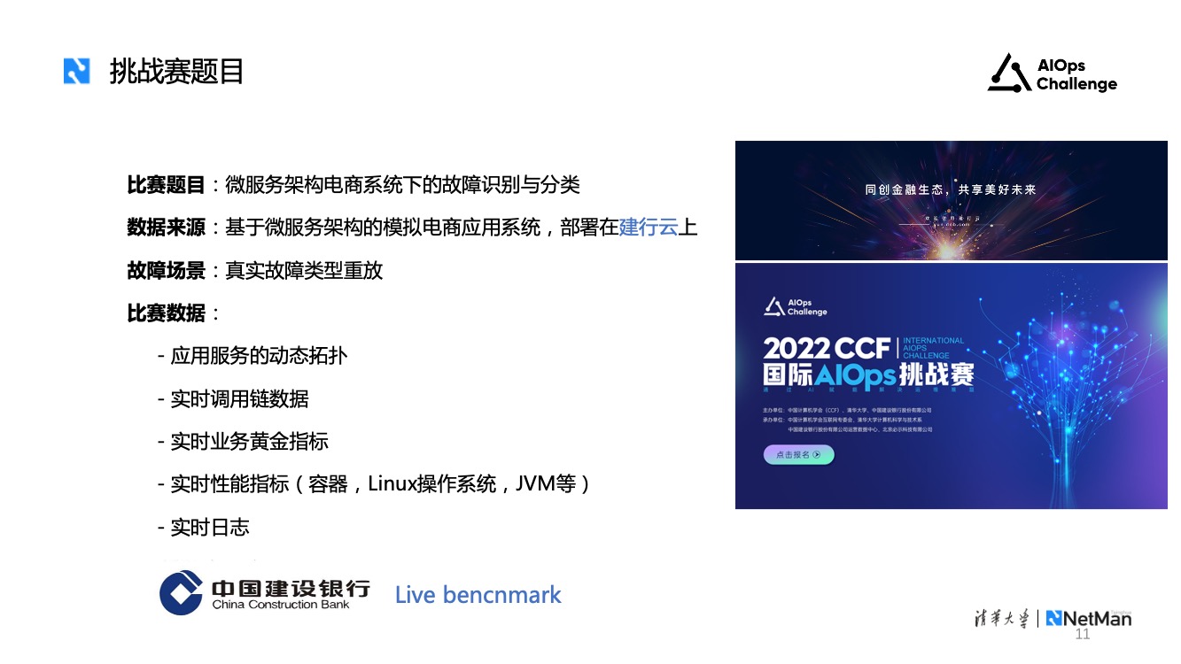本届挑战赛的数据来源于基于微服务架构的模拟电商系统。系统部署在建行云上,其流量和真实业务流量一致。故障场景是由真实系统中总结的故障类型,分批进行故障重放。比赛数据包括应用服务的动态拓扑、实时调用链数据、实时业务黄金指标、性能指标和日志。性能指标来自于容器、操作系统和JVM等。另外在本届比赛结束后,我们计划依托建行云打造AIOps Live benchmark,持续在云上为大家提供丰富数据。