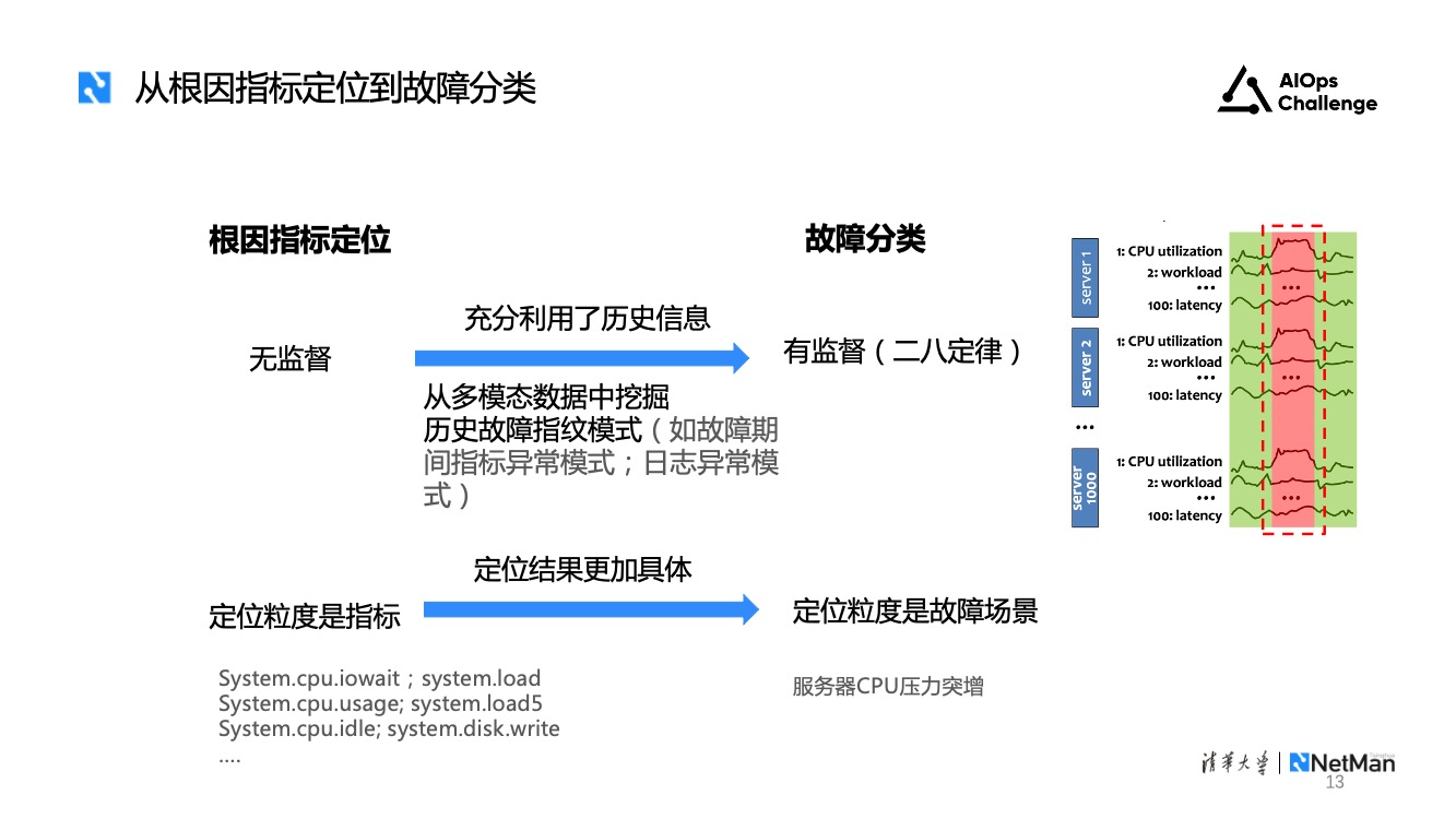 另外,根因指标的定位粒度是指标。但在实际运维中,指标的粒度过于细致,无法给出运维人员可操作的止损决策。且指标间是有关联的,故障发生时可能有多个指标表现异常。相比之下,故障分类可以直接端到端给出故障场景,结果更加明确,使运维人员可以直接采取对应的止损措施。
