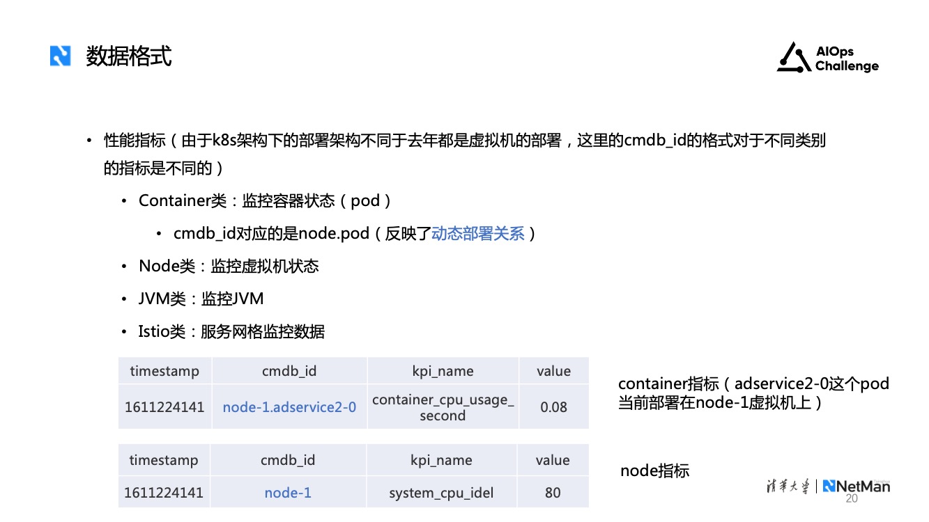 - 性能指标,记录基础设施层面的性能信息。它的格式包括时间戳、cmdb_id、kpi_name和value。由于K8s的部署架构不同于去年的虚拟机部署架构,所以这里不同类型的性能指标对应的cmdb_id格式可能不同。