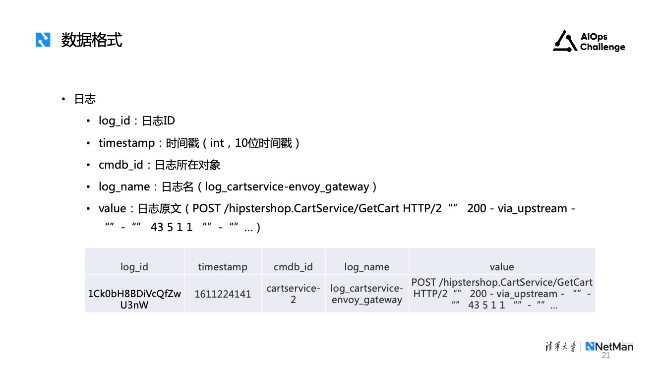 - 日志格式,包括日志的ID、时间戳、cmdb_id、日志名称和日志原文信息。