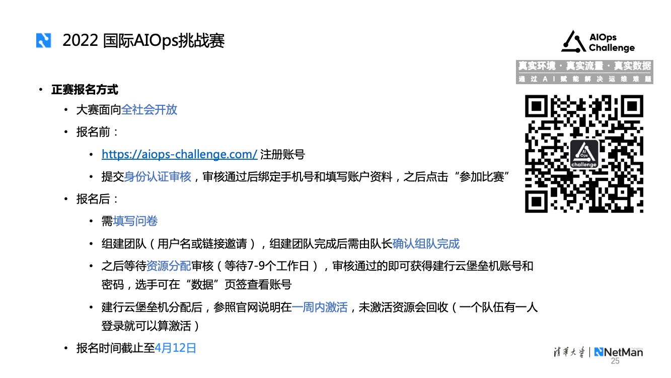 报名中有两个注意事项。首先是选手报名后,每一位选手都需要填写调查问卷,问卷的地址在“数据”页签下面。另外组队完成后一定要由队长点击确认,才会被认定为已就绪的队伍。只有确认组队完成,主办方才会为选手分配建行云资源。后续我们会在微信群进行赛事通知和相关的技术答疑,建议队伍里的每一位成员入群,扫描上图二维码添加AIOps_Challenge微信号,备注报名参赛即可进群。