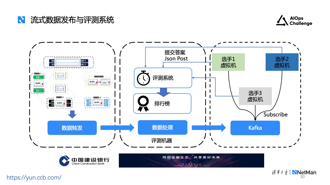 本届挑战赛的初赛和复赛采用在线评测方式。其中微服务系统生成的实时监控数据会转发到主办方的评测机器,处理后通过Kafka发布给选手。选手订阅Kafka,按照指定的topic读取数据进行检测和分类。选手检测到故障后,把结果通过post提交给评测系统,评测系统会展示排行榜。