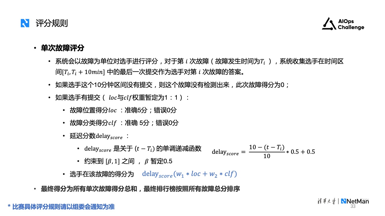 评分规则主要从以下几个方面考虑,分别是故障检测延迟、故障检测准确率、检测召回率、定位准确率和分类准确率。