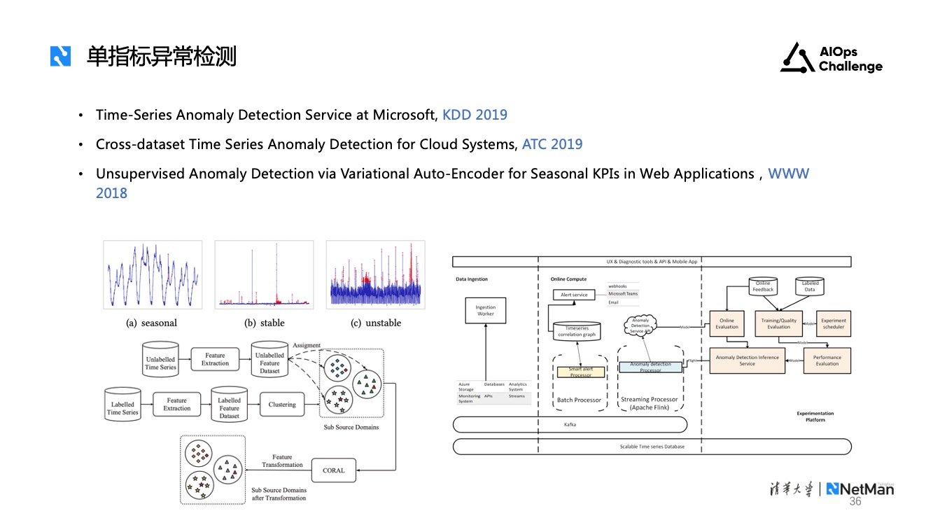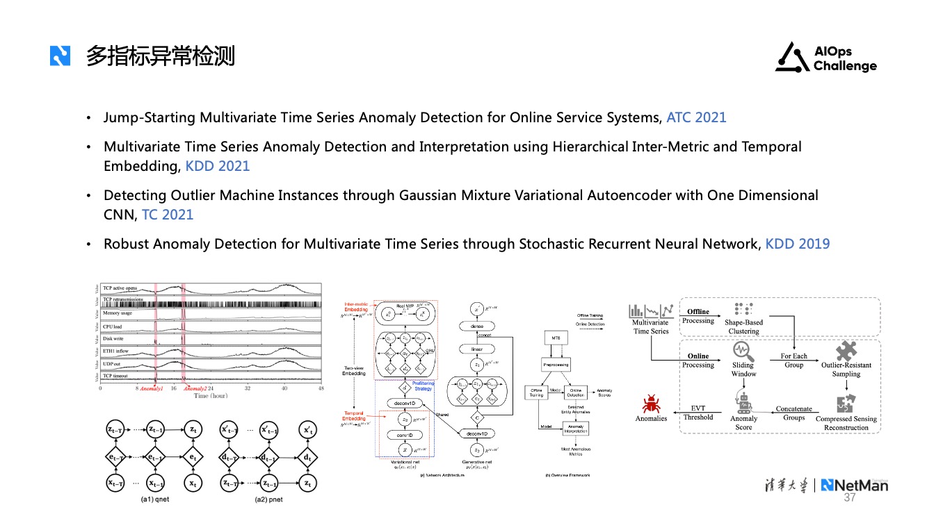 多指标异常检测。对于一个系统而言,单条指标难以表征其整体状况,需要综合多维度指标进行判断。考虑到一些机器性能指标数量巨大,对单一指标做异常检测容易产生很多告警,且模型训练开销大。针对这一问题,近几年学术界有很多关于多指标异常检测的工作,这里列出的4篇都是我们实验室近几年发表的相关论文供大家参考。