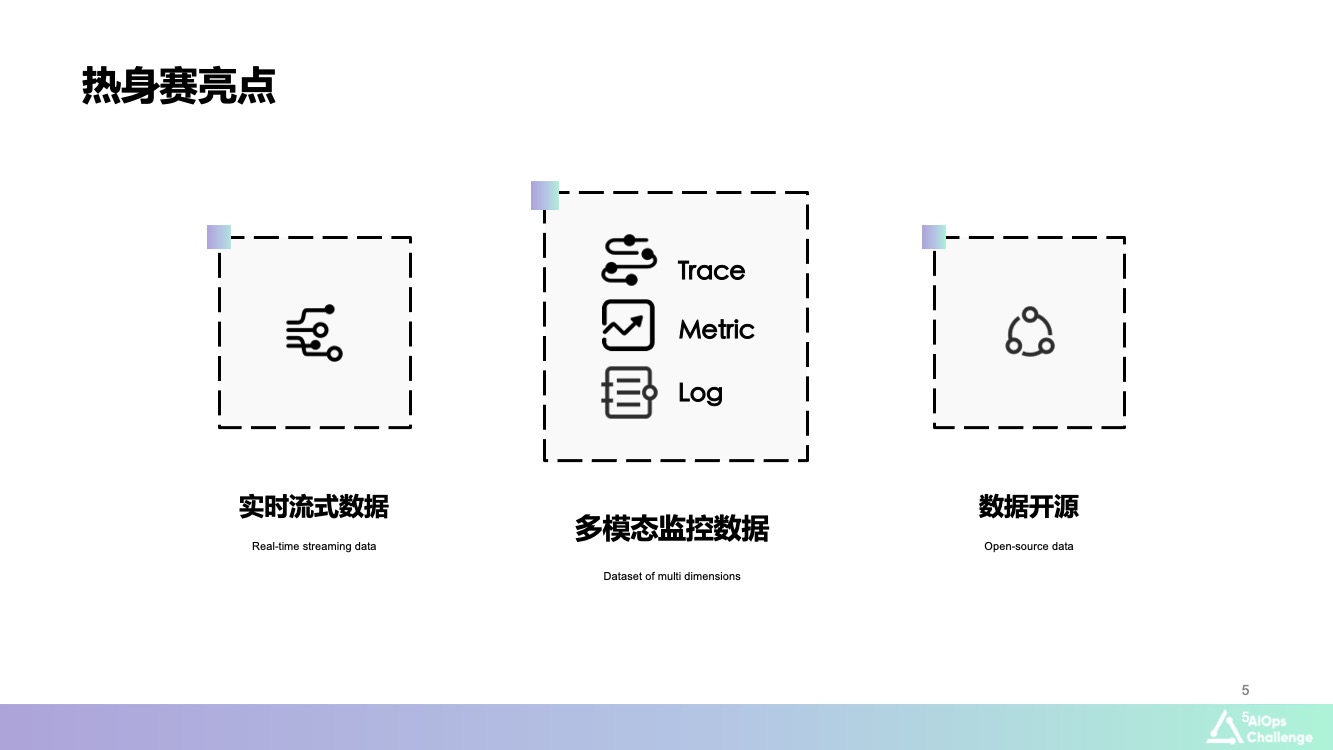 对此,2022 CCF国际AIOps挑战赛基于“正赛”,额外提供一条热身赛道,持续输出开放数据至初赛结束。热身赛成绩不计入正赛积分,且不影响正赛参赛。热身赛为选手提供熟悉竞赛、优化算法的数据通道,同时热身赛数据会全部开源给选手使用。