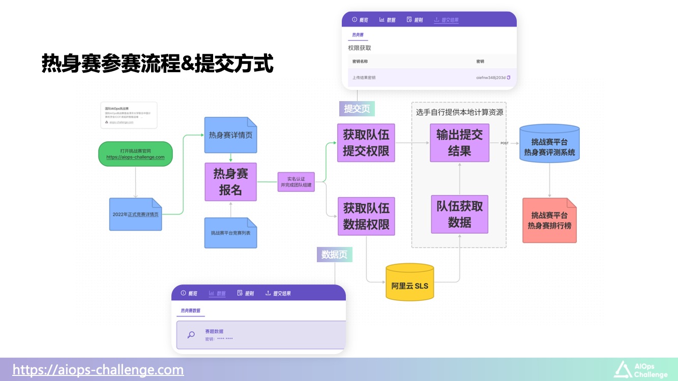 热身赛开放时间自4月中旬至5月中旬正赛初赛结束。热身赛竞赛数据消费由阿里云SLS提供,评测环境由挑战赛平台(http://competition.aiops-challenge.com/)提供。选手可在本地通过互联网访问数据并提交答案。数据内容和评分方案将尽可能与正赛保持一致。