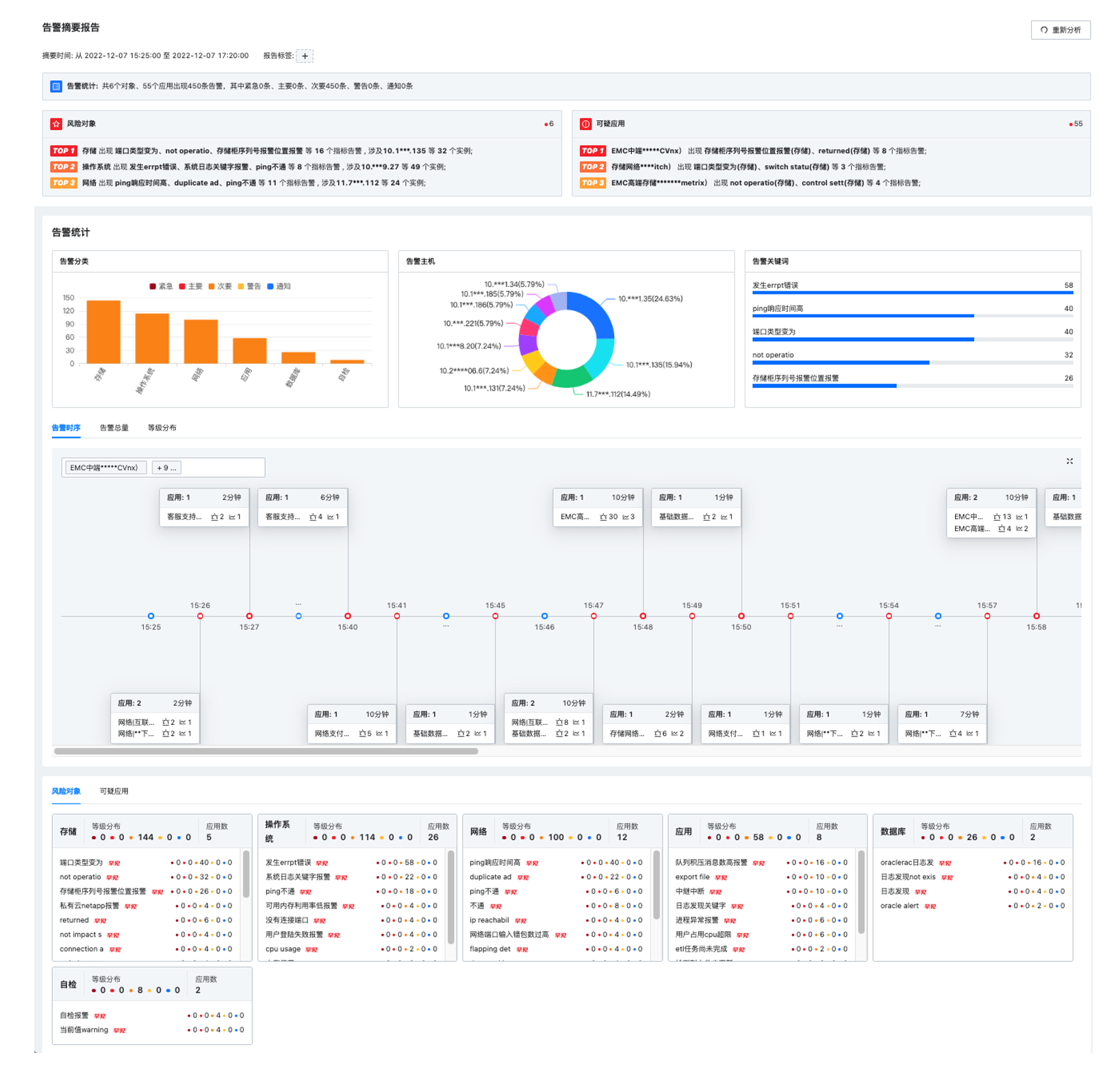 为了帮助运维人员在故障发现时,尤其是告警风暴时提升故障排查和处置效率,实现分钟级的故障定界,必示智能事件管理平台通过摘要分析模块的告警摘要分析汇总、问题组件定位、可疑应用定位、全局告警时序图等能力,实现多维度多视角的告警分析报告。