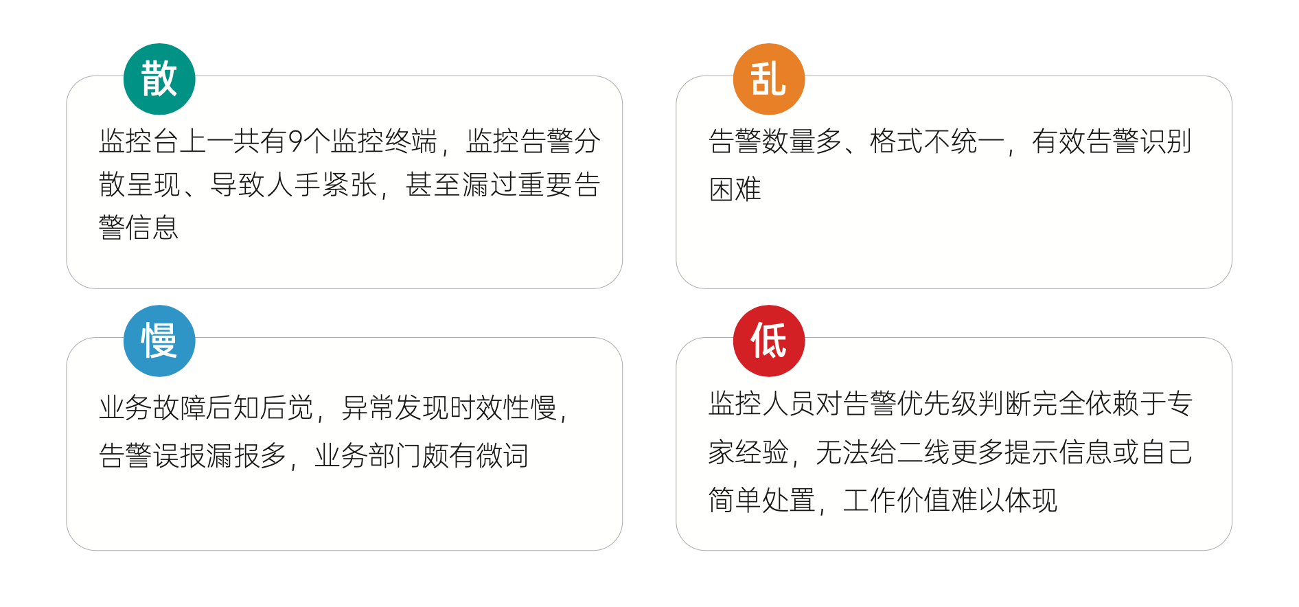 而传统告警管理平台,多数仅聚焦于告警的集中管控,缺乏对告警的分析及结论推荐。在告警风暴发生时,大规模告警发生时种种问题使相关人员工作难度加大,也易引发告警噪声大、无效告警,导致告警处理不及时等诸多问题。