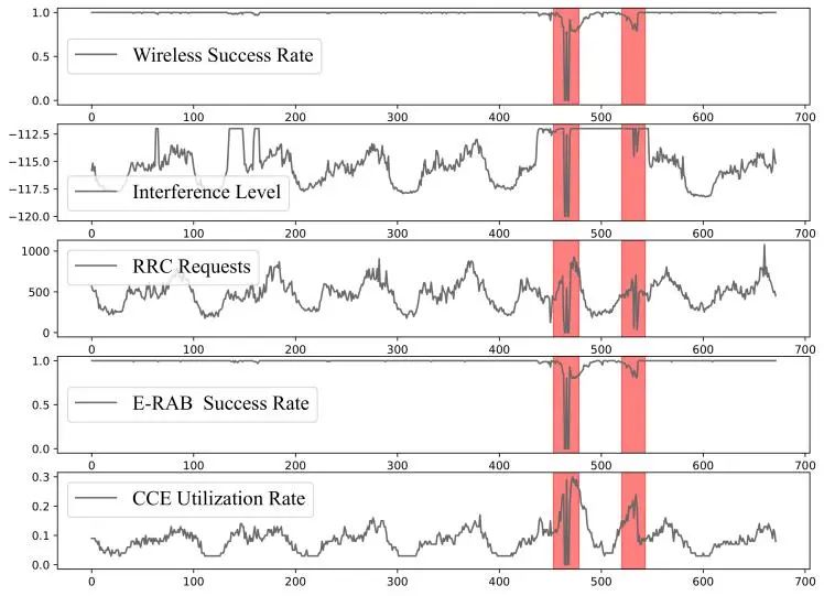 无线基站的多变量时间序列示例,红色矩形标记异常时间段