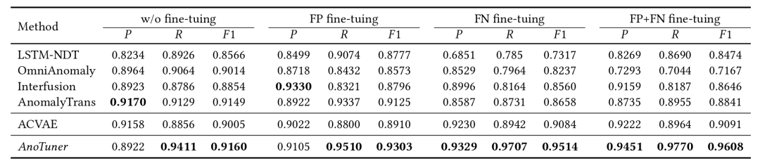 文章对比了AnoTuner与5个多维时间序列异常检测模型。为了评估模型从反馈数据中学习的能力,文章将实验分为四组:无反馈微调(w/o fine-tuning)、仅调整误报(FP fine-tuning)、仅调整漏报(FN fine-tuning)和同时使用误报和漏报反馈进行微调(FP+FN fine-tuning)。最终的实验结果如表1所示。AnoTuner在所有方法表现最佳,在微调后的F1-Score提升约为同样具有基于反馈微调机制的ACVAE的五倍,说明AnoTuner可以更有效地利用反馈数据。