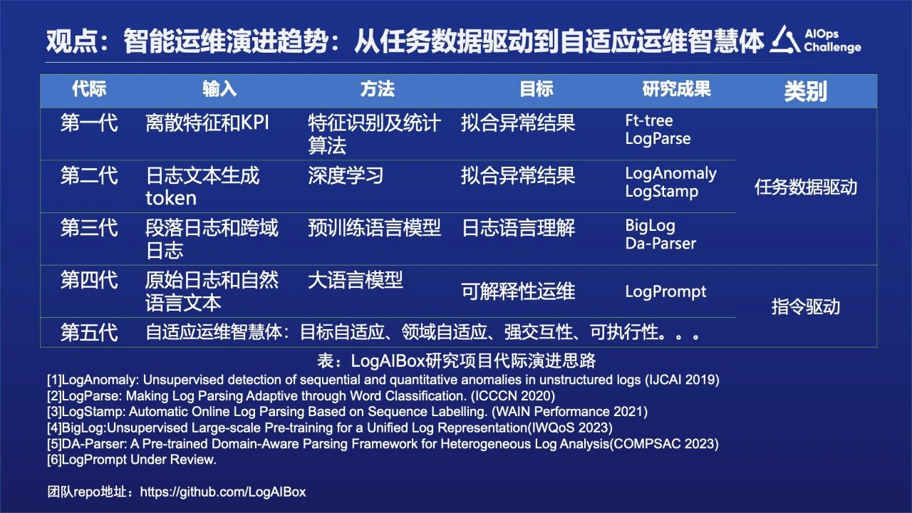 从第一代到第三代是任务数据驱动型,到第五代大模型出现之后转变为指令驱动的方式,就是构建自动自适应的智能运维体的方式。