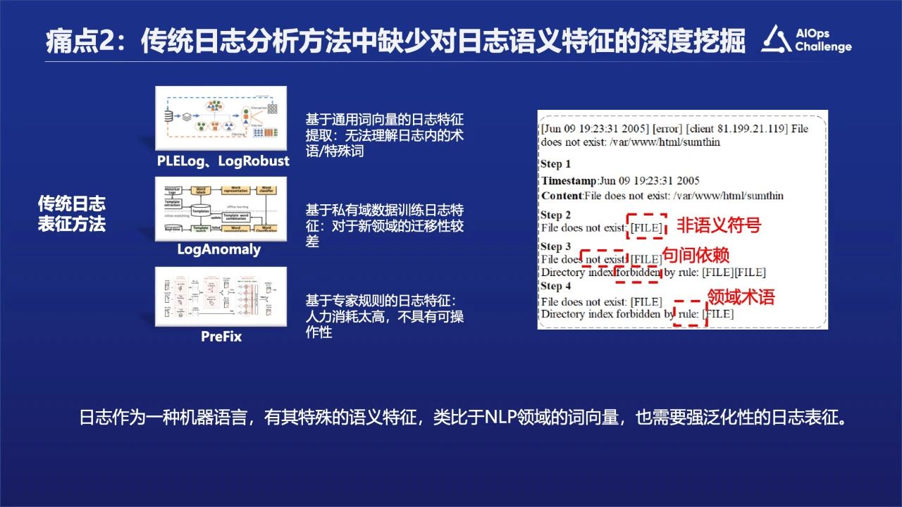 痛点二:传统日志分析方法中缺少对日志语义特征的深度挖掘以及对语义的理解。