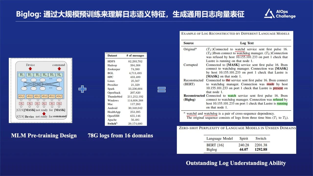 为了解决上述痛点问题,我们团队做了深入的研究工作,有两个解决方案,第一个就是Biglog, 基于大规模日志预训练理解日志机器语言、构建日志多任务统一框架,解决传统运维系统没有统一框架的问题和传统日志分析对于日志语义理解特征的一些痛点问题。我们是基于LogHub开源数据再加上自己的数据做的训练工作。