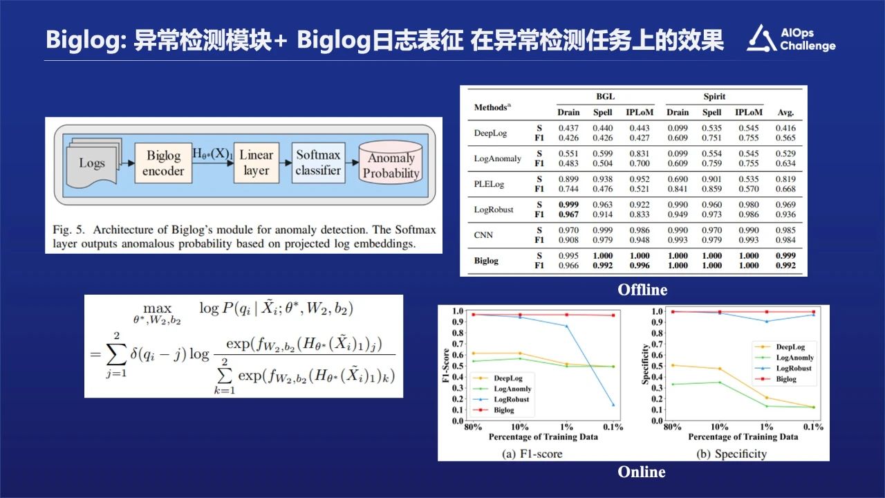 图片中展示的是在异常检测的任务上的效果。Offline的结果显示模型和算法的效果都是挺不错的,基本上都接近1。Online训练时训练数据是在不间断减少的,并且测试数据越来越多且包含一些未知的日志。当训练数据从80%减少到0.1%的时候,Biglog效果保持的非常好,几乎没有变化。