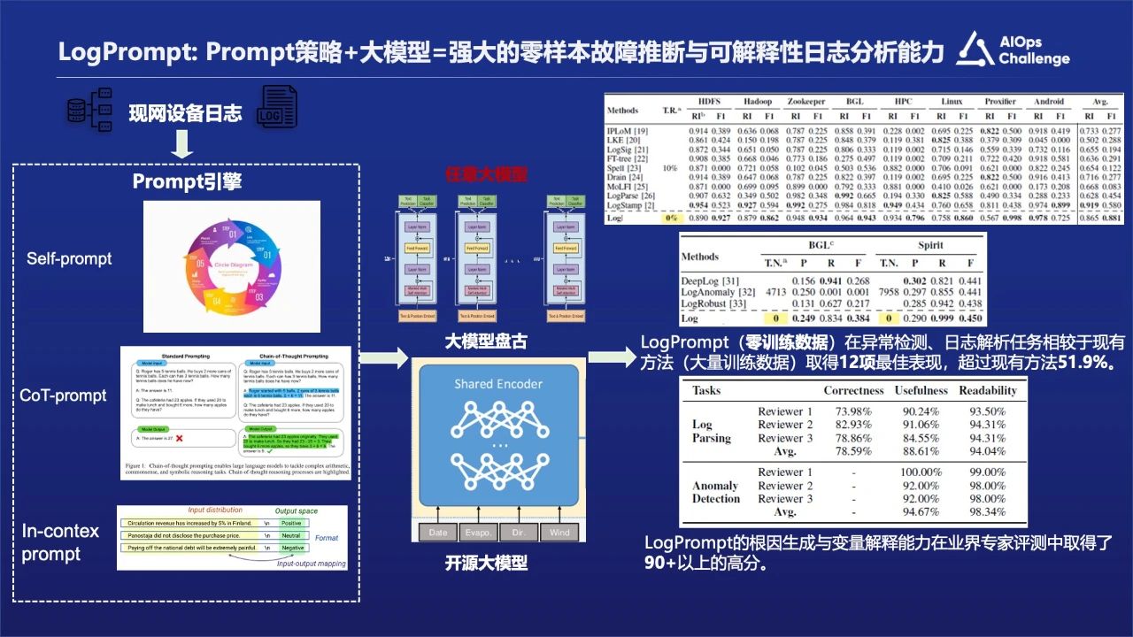 另外一个就是LogPrompt,基于日志适用的Prompt策略驱动强语言模型构建零样本日志分析框架,通过领域prompt策略驱动语言模型,构建零样本的日志分析框架,解决图片上痛点3和痛点4的问题。