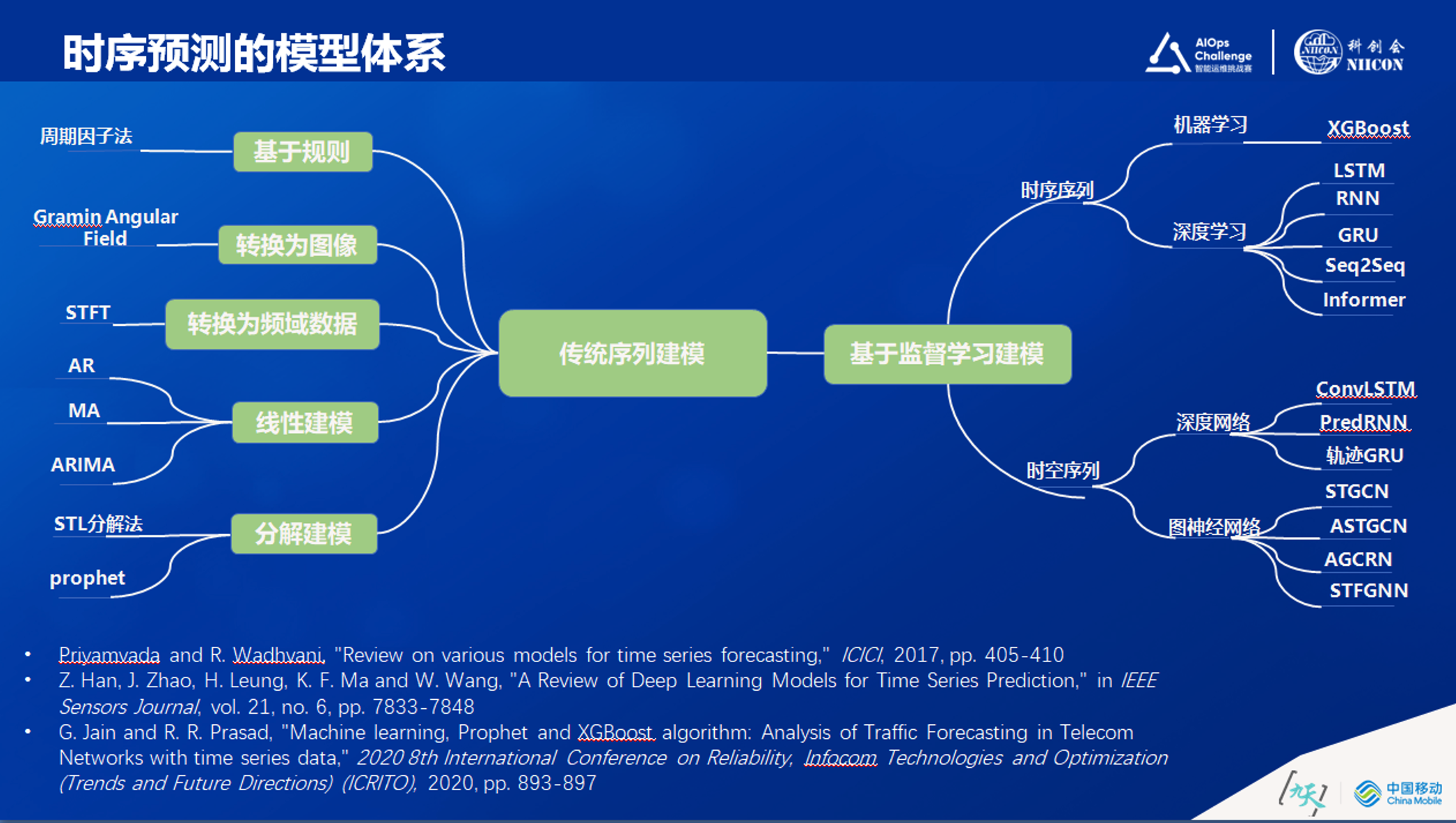 典型的时间序列预测模型是马尔可夫在九十年代提出的。从左侧算法看到传统的预测建模方法在企业的运营当中是很常用的。比如说周期因子法、转换为图像法(把运维领域复杂的数据,尤其把大量的告警,直接转化为图片的形式做处理)、转换为频域法(转为频域的数据进行处理)、各种线性模型、各种基于因素分解的模型(分析出哪些是长期趋势,哪些是季节性的,哪些是节日性的,哪些是突发的,哪些是随机不可预测的),这些是属于传统建模领域的应用。