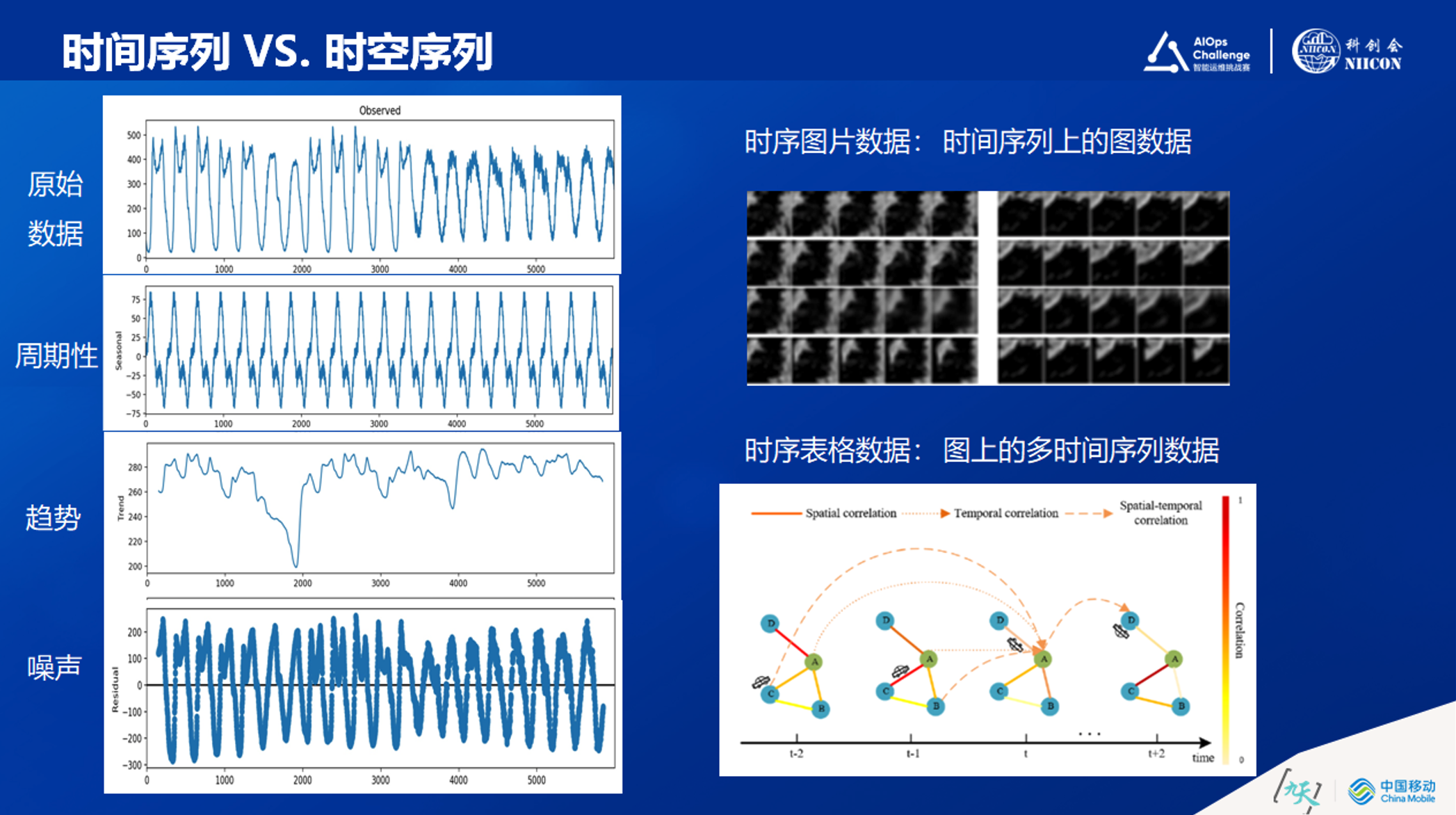 时间序列和时空序列的区别是什么?左侧是时间序列,原始数据是单一的时间序列,原始数据可以分解为周期性、趋势、噪声等多个维度。右侧是时空序列,可以分为两种形式,一种是时序图片数据,一种是时序表格数据。时序图片数据:预测天气的遥感图片,随着时间的推移图片会有各种变化,图片本身已经存在二维信息,再加时间维度,从而得到基于图片的时空预测。时序表格数据:在移动通信网中,更多是时空表格类数据。在选定的时间段内,网元自身和网元间存在多维度时序数据,构成表格数据;同时存在不同时间段,构成多个时序表格数据。