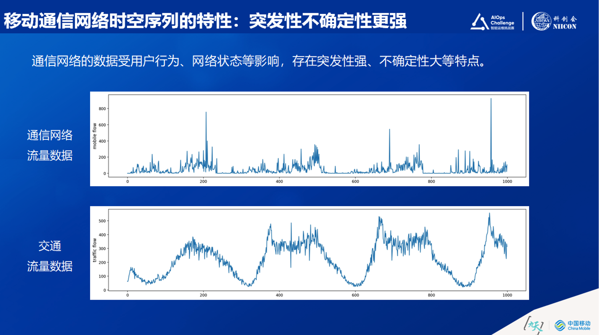 另外一点是突发性。突发性的原因有很多维度,包括用户行为的突发性,网络状态的突发性等。从公开的行业数据和中国移动企业自身数据对比来看,移动通信网络的不确定性会更强。