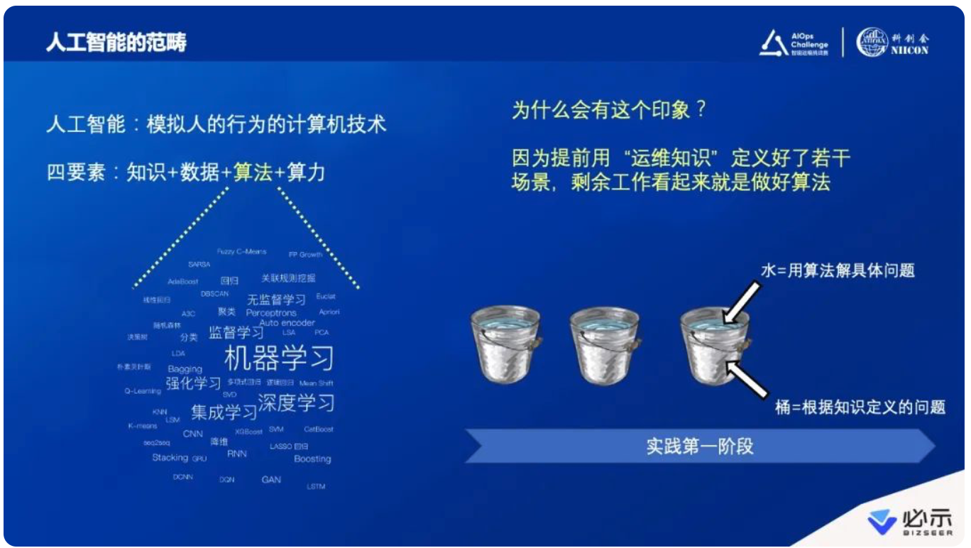 这里做一个比喻,就像不同的桶装不同的水,先由既有运维经验又有一定算法能力的专家定义好“桶”,“桶”即专家根据知识定义的问题;然后在上面做算法研究,往里面倒“水”,“水”即用算法解决具体问题,把“算法”做得越来越好,把“桶”倒得越来越满。