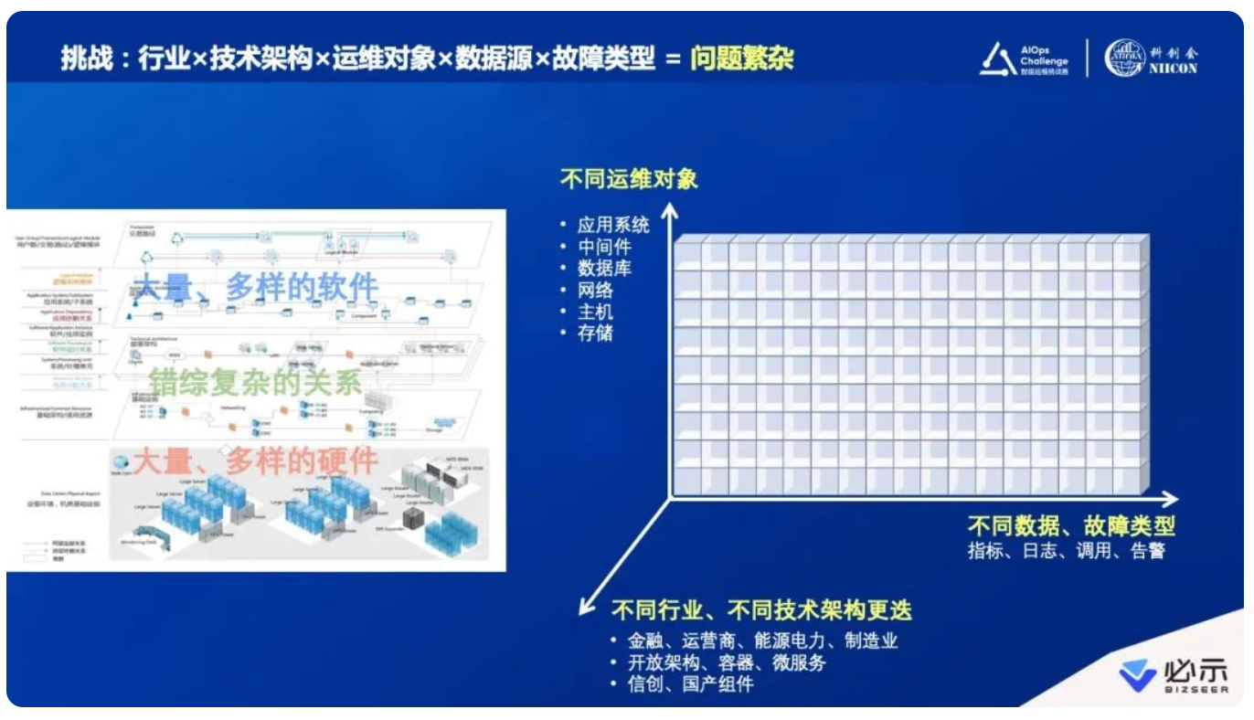 伴随这样的实践往前走,我们发现开始遇到新的挑战,如同看到冰山一角逐渐延展开一样,要解决的场景(桶)特别多。大家可以看下我列的标题,“行业×技术架构×运维对象×数据源×故障类型”,乘积之后问题维度变得特别多、特别繁杂。